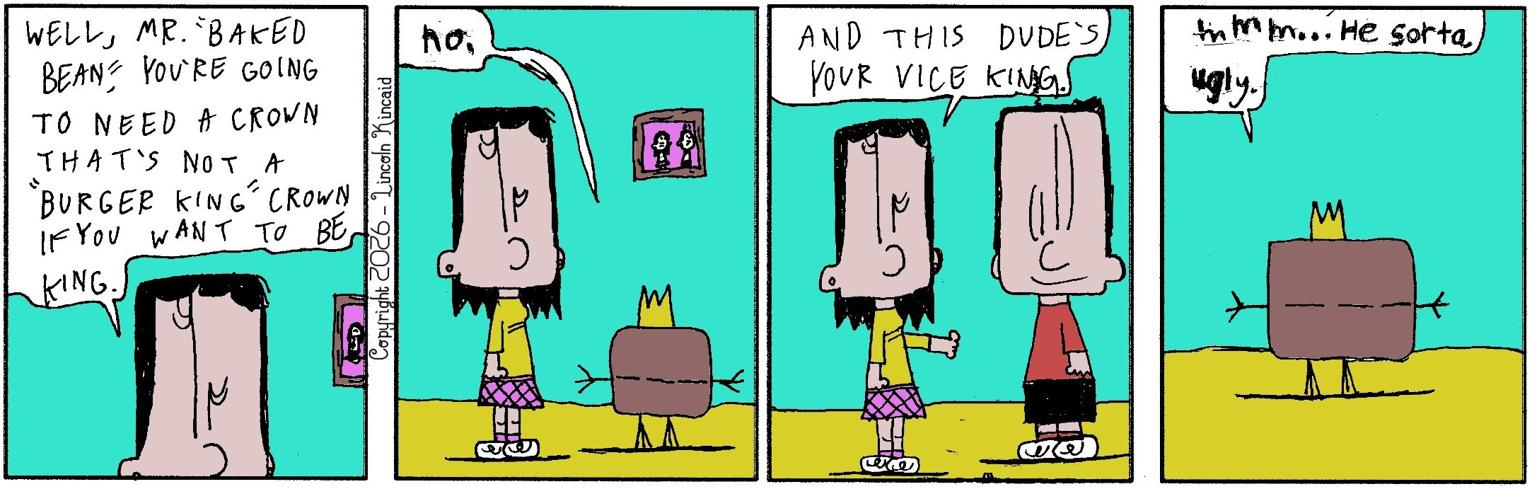 My name is Lincoln Kincaid and I am 13 years old. I have been drawing comics for about 4-5 years. My comic is set in the chaotic kingdom of Beantopia, where the King B.B. (who is a baked bean) rules the land, along with his Vice King, Kaleb, and his Secretary, Olivia. And lots of wacky adventures occur. That a lot of time make zero sense.
